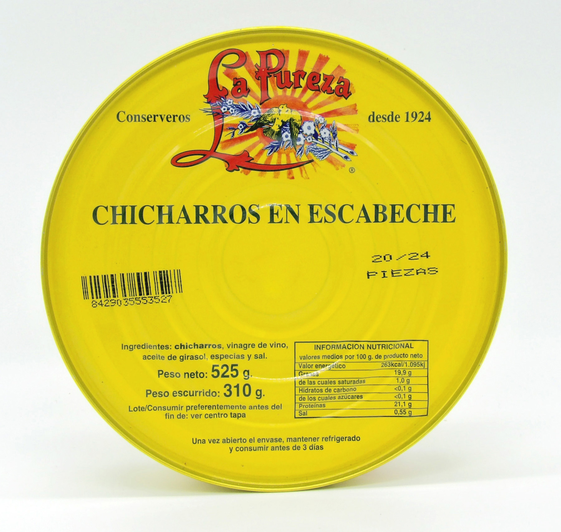 Ingredientes: Chicharro,vinagre, aceite de girasol, especias y sal.